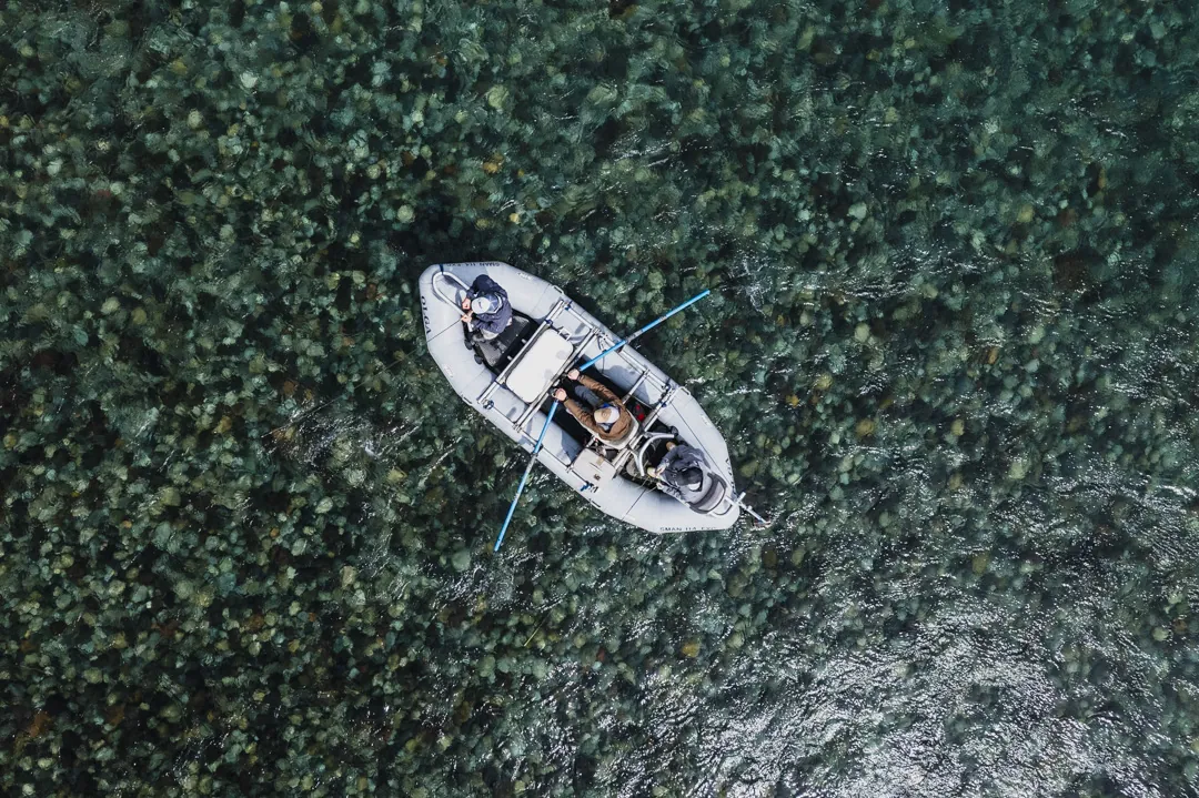 • Aerial view of a drift boat fishing on a scenic Patagonia river bordered by vibrant green trees