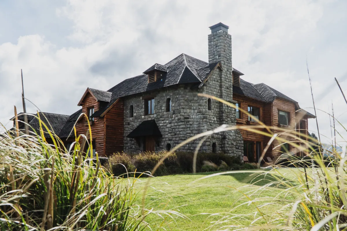 • Exterior view of a grand stone and timber fishing lodge nestled in the Patagonia landscape